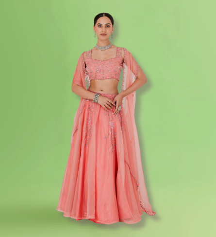 Dusty Pink Hand Embroidered Organza Lehenga (Set of 3)