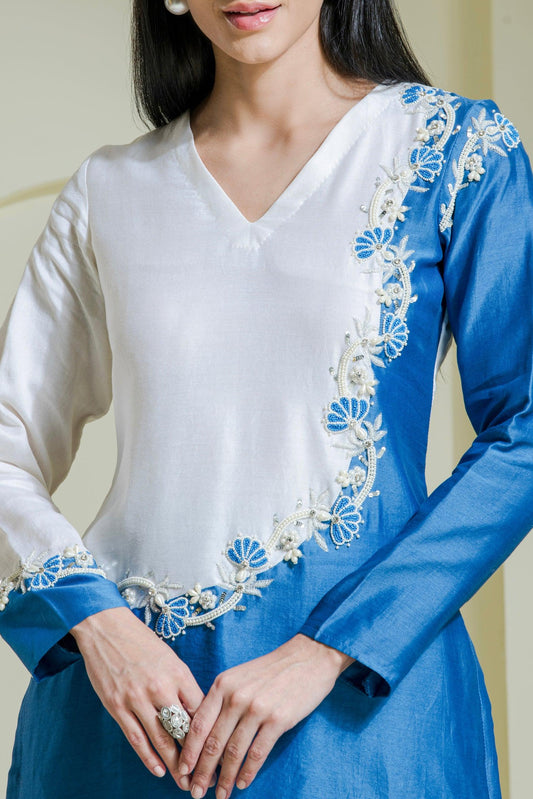 White & Blue Hand Embroidered Chanderi Kurta Set (Set of 2 )