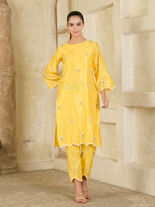 Vibrant Yellow Hand Embroidered Chanderi Kurta and Pants ( Set of 2 )